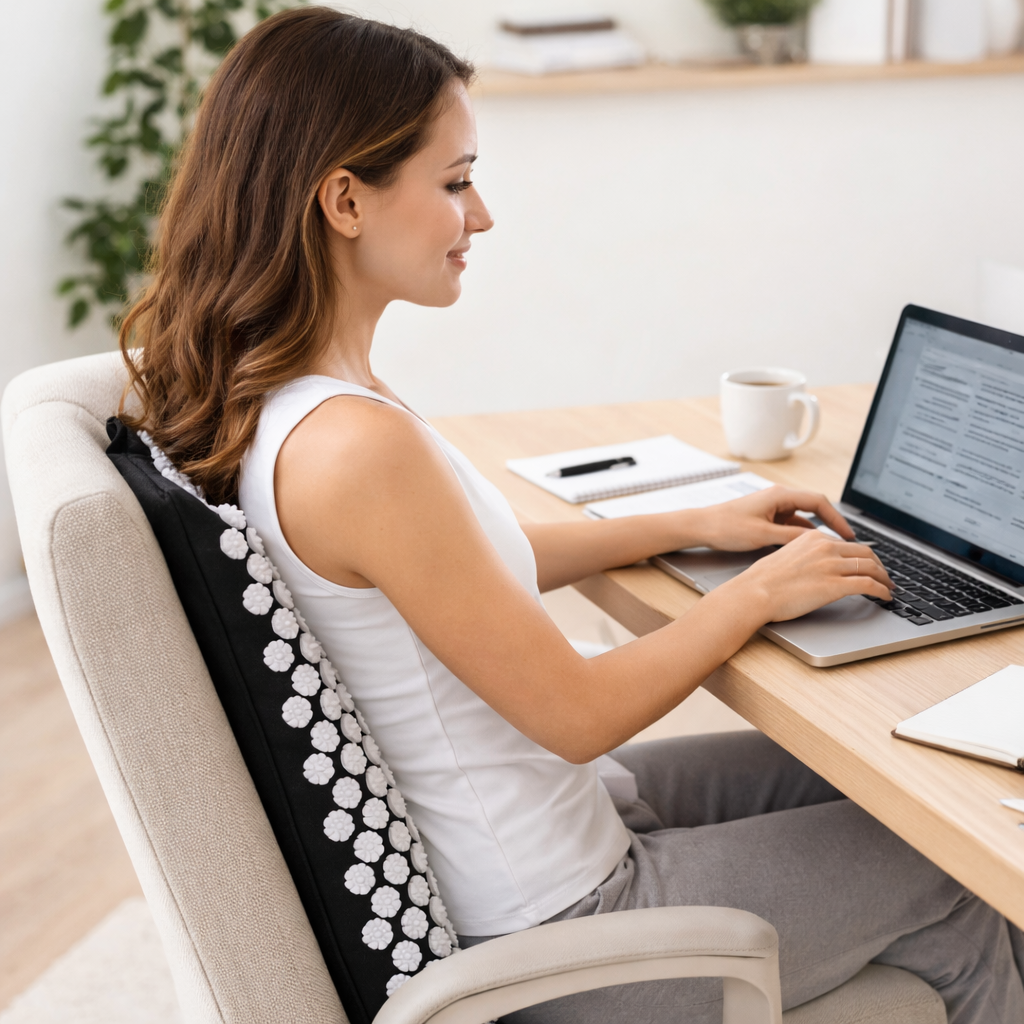 Helyezd a szék háttámlájára, és használd munka közben, anélkül hogy megszakítanád a fókuszt.Segít csökkenteni a hát és váll terhelését hosszú ülés során, miközben aktívan támogatja a testérzetet.